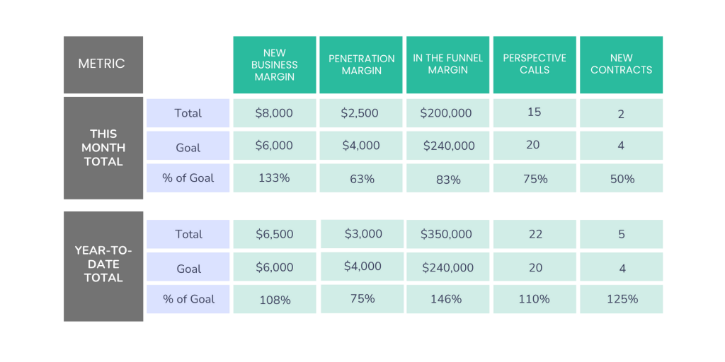 - In the Funnel Margin (ITF): This metric tracks the total margin dollars expected from all prospects set to close within the next three months. Moreover, this forward-looking metric ensures your pipeline remains healthy and predictable.
